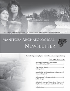The Manitoba Archaeological Society publishes a quarterly newsletter featuring current news and interesting archaeological projects happening across the province. Preview the Manitoba Archaeological Newsletter for March 2006 below: